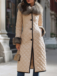 Crafted for the discerning fashionista, this **sophisticated** quilted long coat offers a perfect blend of **style** and functionality. The luxurious faux fur trim adds a touch of glam, while the soft beige hue ensures versatility for both **day-to-night** wear in colder seasons.